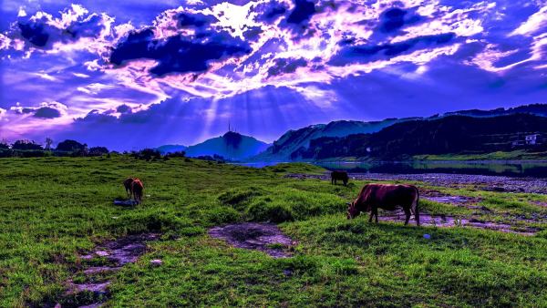 丁达尔光下的岷江牧场