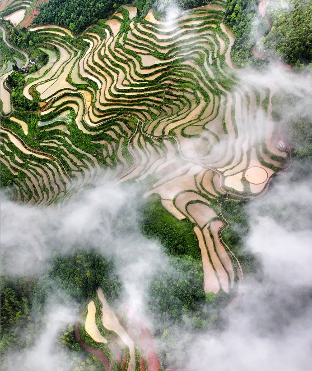 推封理由:俯拍视角 展现梯田的宏观韵律,曲线的重复与云雾的朦胧,让自然与人文景观交融,传递出 “大地艺术” 般的审美,也暗含对传统农耕智慧的致敬。