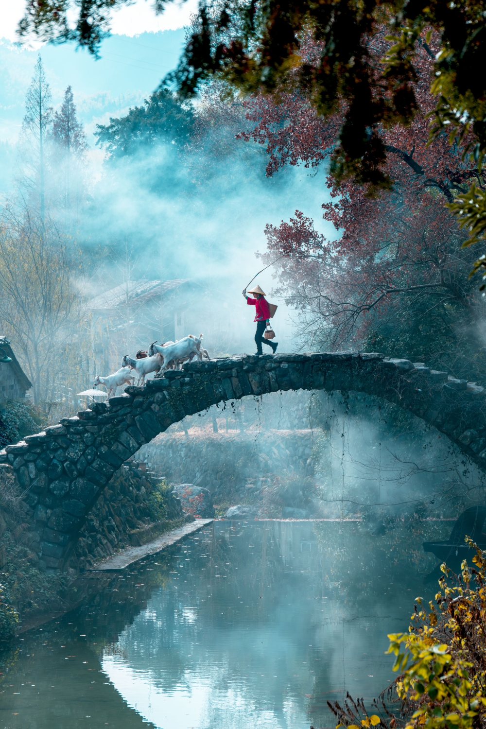 推封理由:薄雾缭绕的石拱桥(估计是烟饼),带着红枫的树木,远处隐约的村落,雾气让画面自带朦胧的诗意,既有江南的灵秀朦胧,又有田园生活的松弛自在,是自然与人文气息融合的画面。